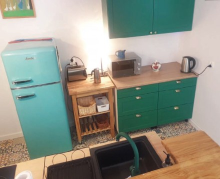 Często podczas remontu kuchni mamy pokusę dokonania w niej całkowitej rewolucji. Tymczasem zmian może wymagać tylko funkcjonalność i design zabudowy, a nie sam układ szafek oraz sprzętów. W tym przypadku kuchenny aneks oddzielony był od salonu murkiem, którego zadaniem było między innymi ukrycie ciągu roboczego. W murku były również instalacje wodno-kanalizacyjne. Szafki do przechowywania produktów i naczyń oraz lodówka umieszczone były na przeciwległej ścianie. Po długich debatach właściciele postanowili kupić całkowicie nowe wyposażenie, ale zostawić ten sam układ zabudowy. Pozostawienie murku pozwoliło uniknąć kosztownych zmian, związanych z przenoszeniem instalacji. Planując nową zabudowę, zrezygnowali jednak z szafek narożnych, kierując się przekonaniem, że proste ciągi zabudowy znacznie ułatwiają korzystanie z mebli. Dzięki precyzyjnemu rozplanowaniu wnętrz szafek poprawiła się także funkcjonalność kuchni. Dolne szafki zamykane drzwiczkami zastąpiono szufladami, które ułatwiają dostęp do produktów i naczyń. Liczbę szafek ograniczono do minimum – tutaj musi się zmieścić jedynie to, co niezbędne podczas kucharzenia na letnisku. Odzyskaną przestrzeń wykorzystano za to na większą lodówkę oraz zmywarkę. Dodatkowe miejsce do przechowywania i pracy zapewniają stoliki pomocnicze – barki na kółkach – jeden stanął między zabudową a lodówką, drugi pod oknem przy wejściu do aneksu. Spojrzenie na kuchnię z perspektywy saloniku przyciąga uwagę efektowną szmaragdową zabudową i turkusową lodówką w stylu retro. Będąc w środku aneksu, widzimy nowoczesną przestrzeń roboczą, a pracując przy niej mamy perspektywę na atrakcyjny pokój dzienny oraz zieleń ogrodu za jego oknami. Dawne położenie zabudowy nabrało nowego wymiaru. W takiej kuchni aż chce się gotować!